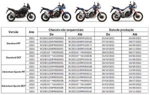 A Honda, pautada pelo seu princípio de respeito aos clientes, convoca os proprietários do modelo CRF 1100L Africa Twin, ano modelo de 2021 a 2024, conforme descrição a seguir, a realizarem o agendamento do atendimento em uma concessionária autorizada Honda a partir do dia 13 de outubro. Os reparos terão início em 15 de outubro de 2025 para substituição do interruptor do punho esquerdo.